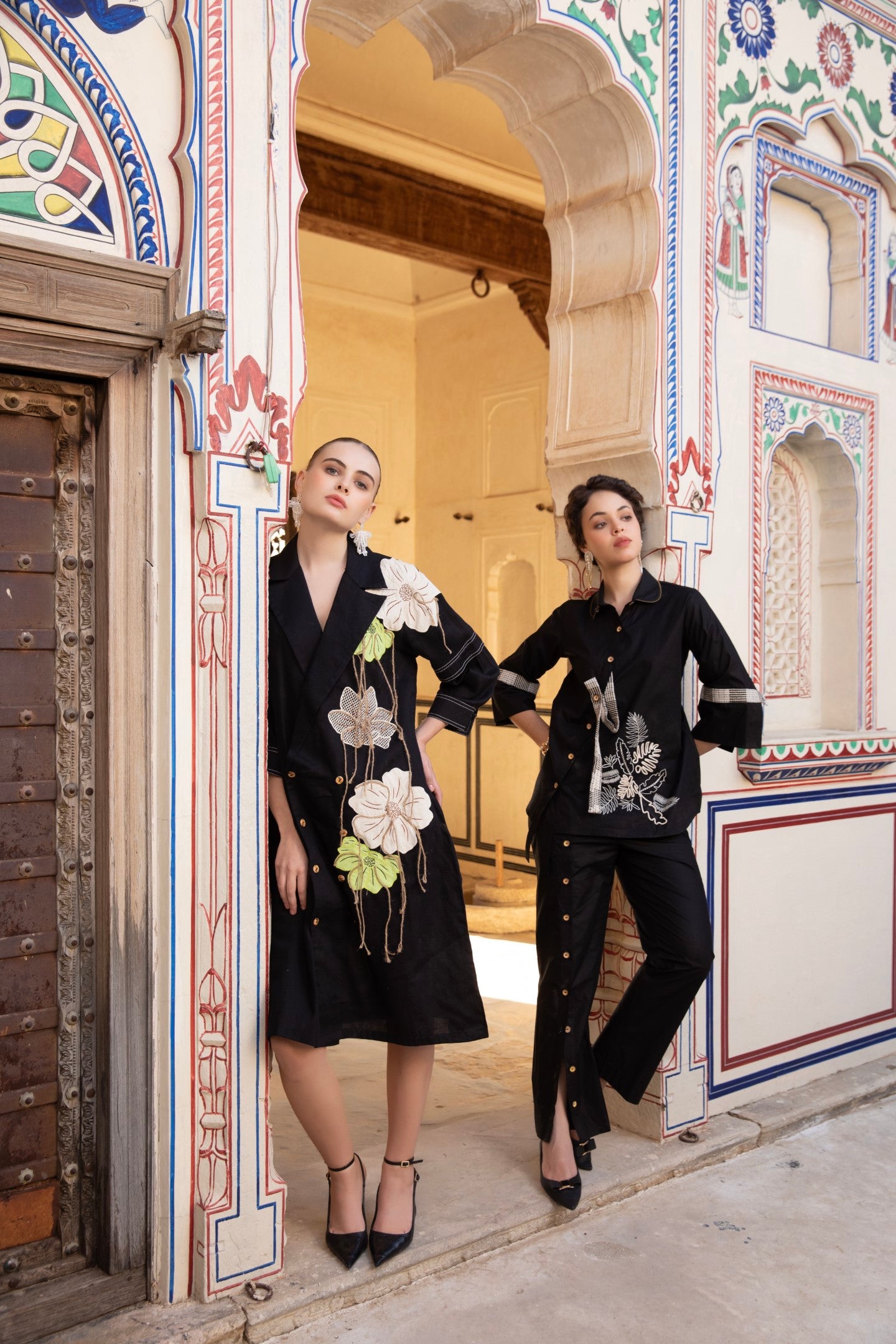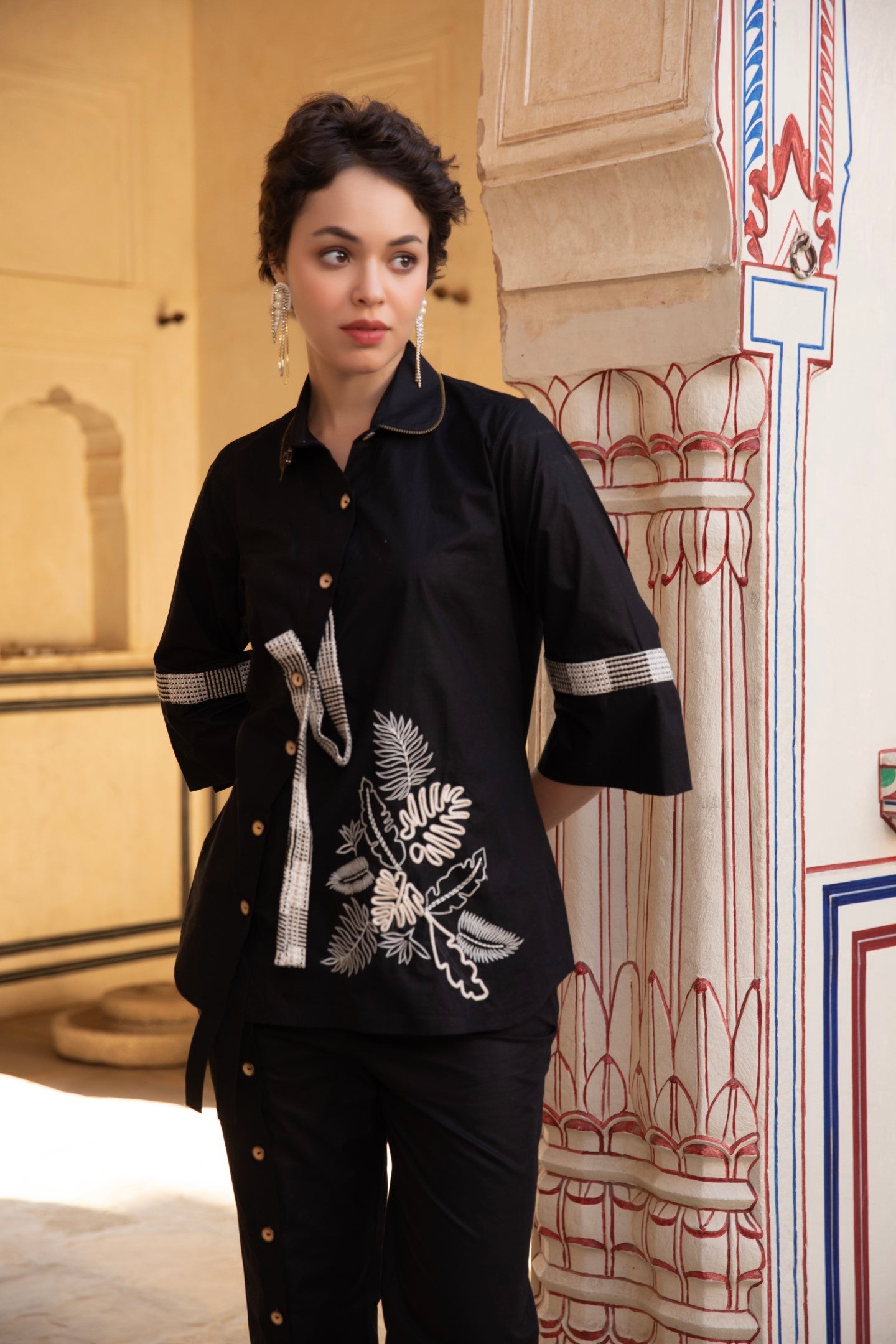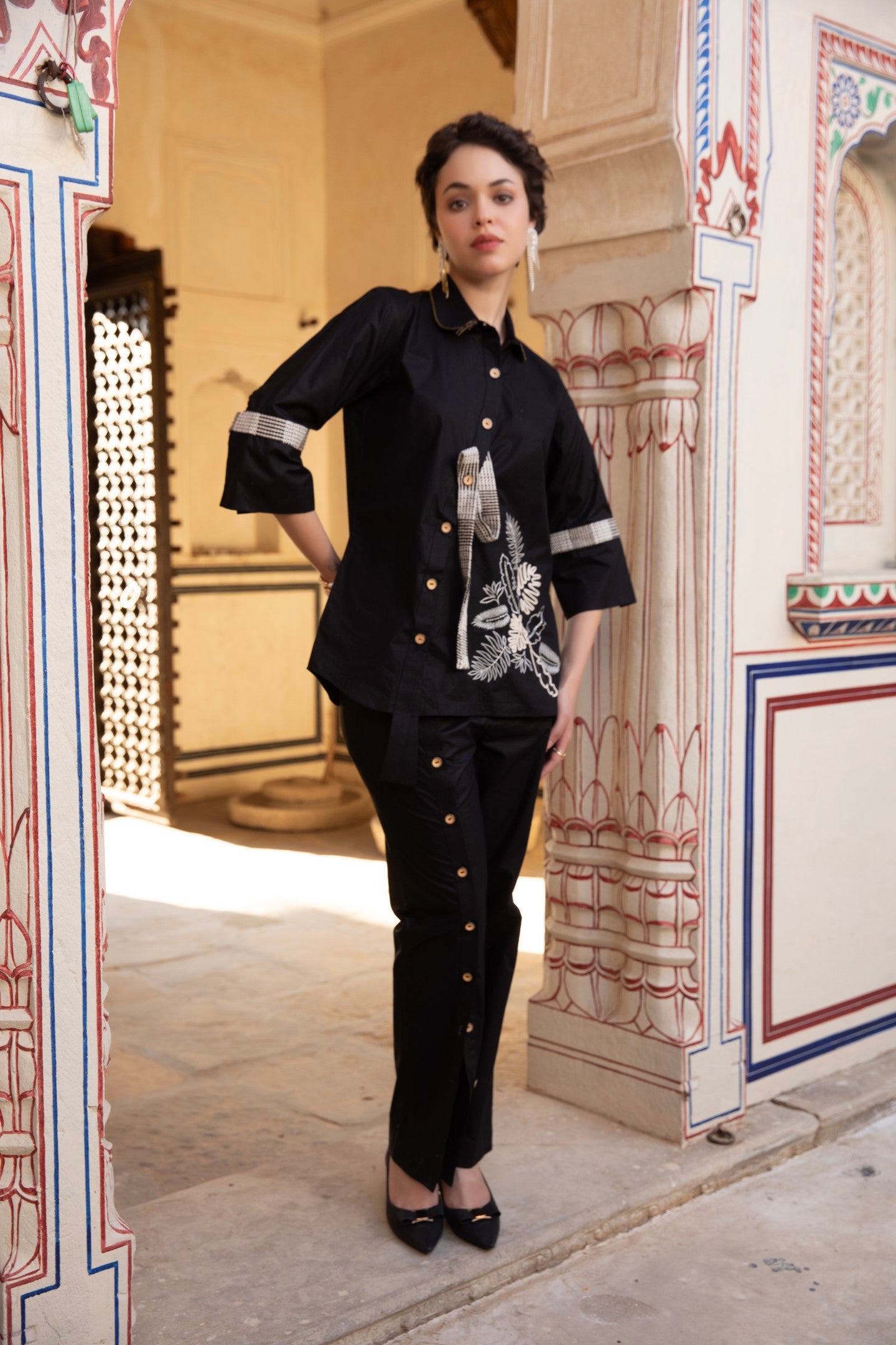 Striking and sophisticated, this black co-ord set redefines modern elegance with intricate hand-embroidered botanical motifs. The structured button-down shirt features contrast detailing on the sleeves and placket, adding a contemporary twist to its classic silhouette. Paired with tailored straight-leg pants adorned with statement wooden buttons along the sides, this ensemble is a bold yet refined choice for art soirées, intimate dinner gatherings, or stylish city explorations.