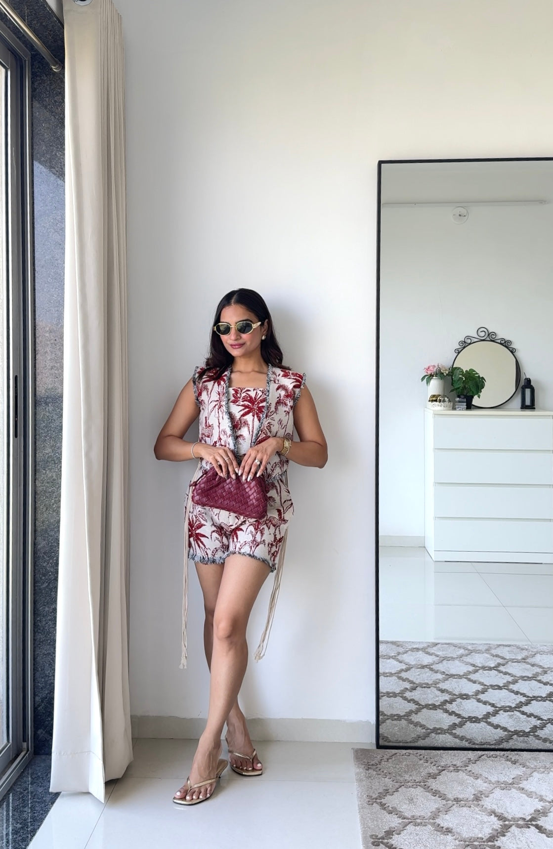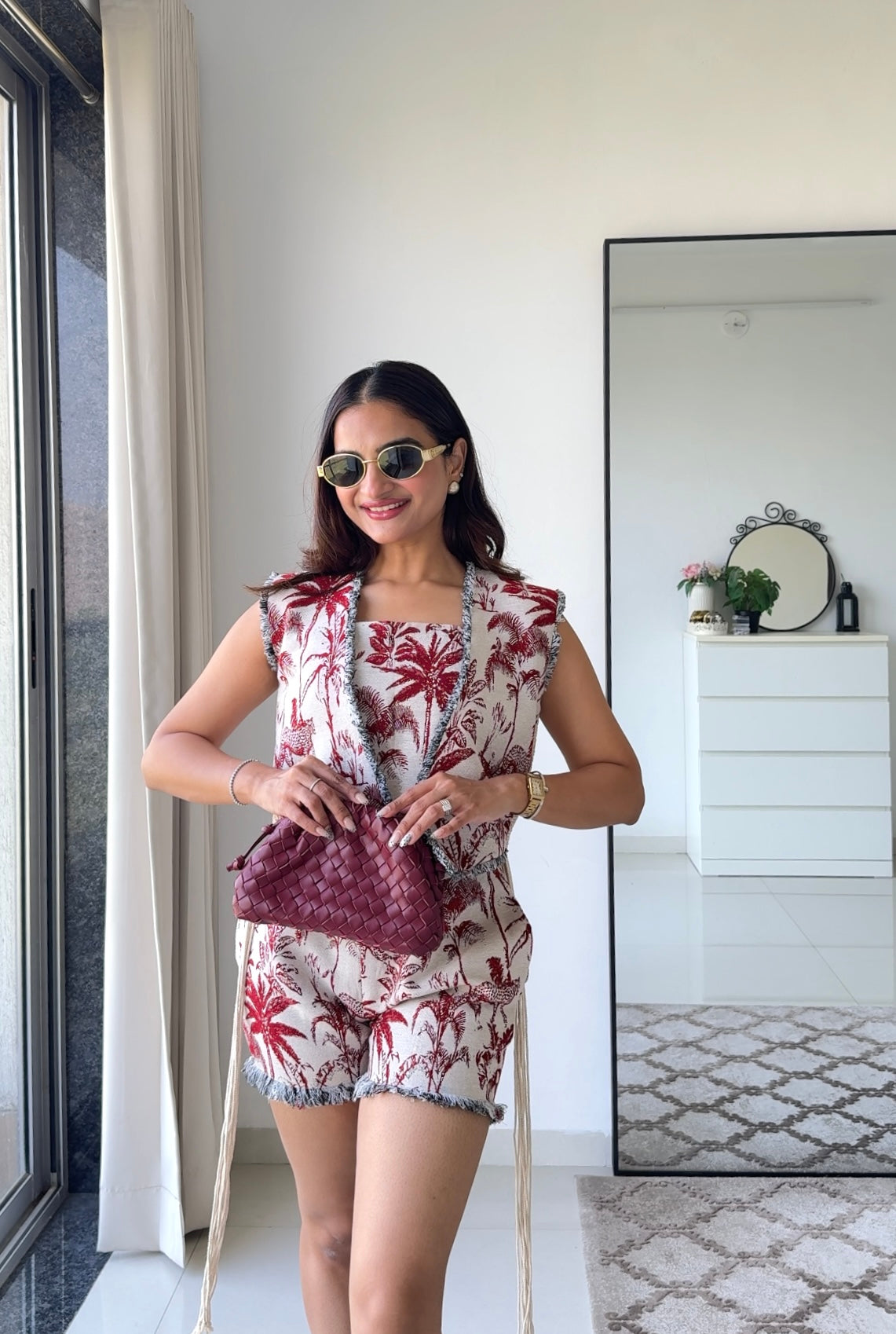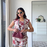 The Tropical Tiger Set is a bold and luxurious 3-piece ensemble handcrafted in red and white cotton jacquard. Featuring intricate handwoven tiger, bird, and tropical motifs, this set includes a structured bustier, tailored shorts, and a matching open jacket. Perfect for resort wear or destination getaways, it effortlessly combines artisanal craftsmanship with contemporary vacation style.