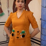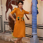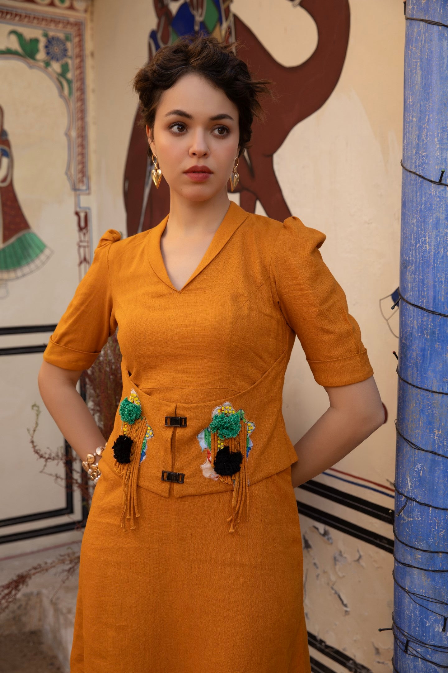 Introducing our Saffron Bloom Dress, a stunning fusion of tradition and modernity. Crafted from rich mustard-hued fabric, this midi dress features a flattering V-neckline, structured shoulders, and half sleeves. The standout element is the intricately designed waist belt adorned with handcrafted tassels, textured appliqué, and artistic embellishments in shades of green, black, and ivory, adding a bohemian yet regal touch.