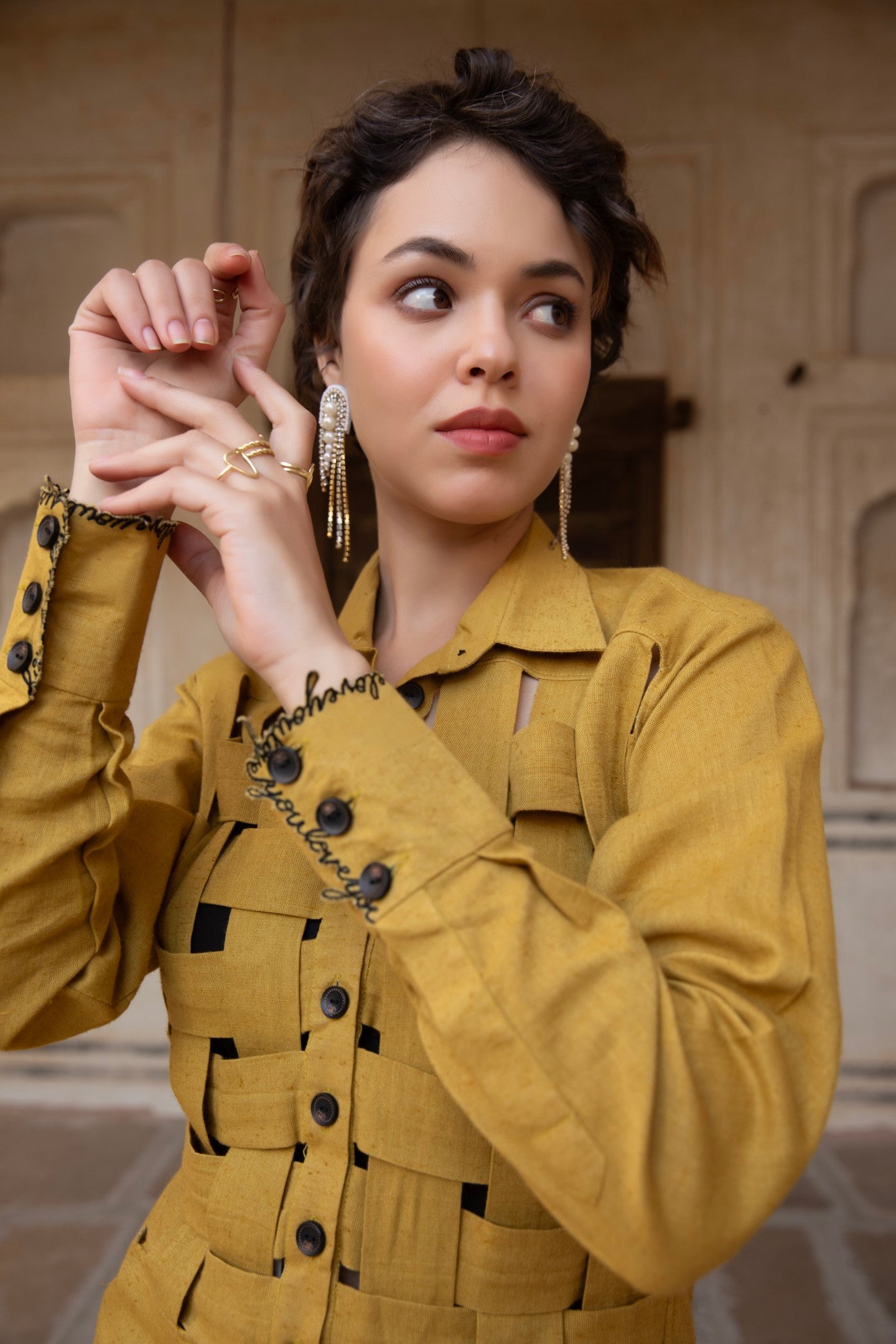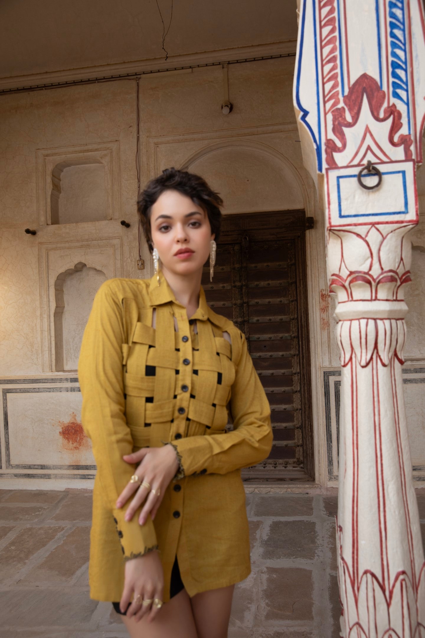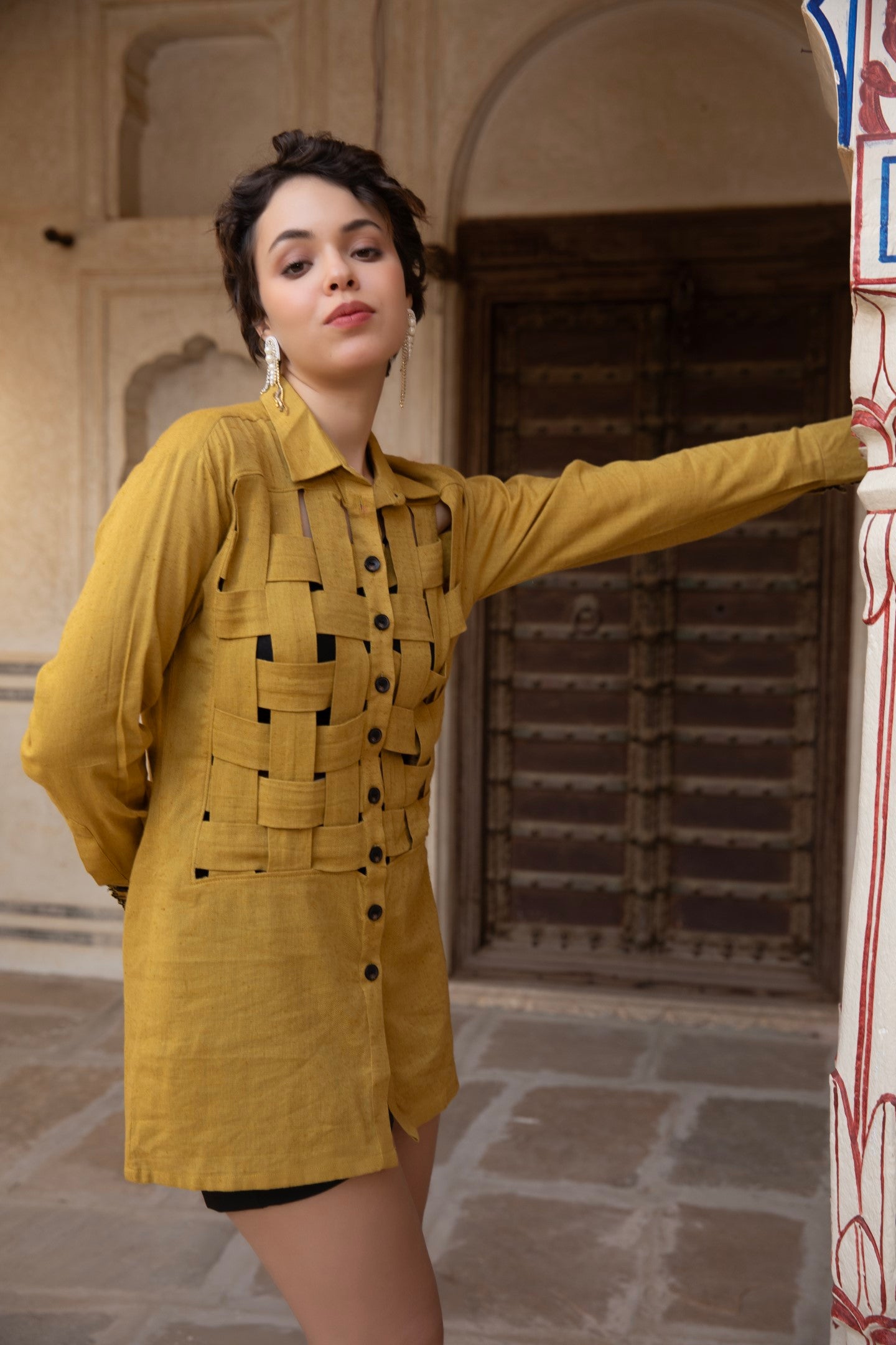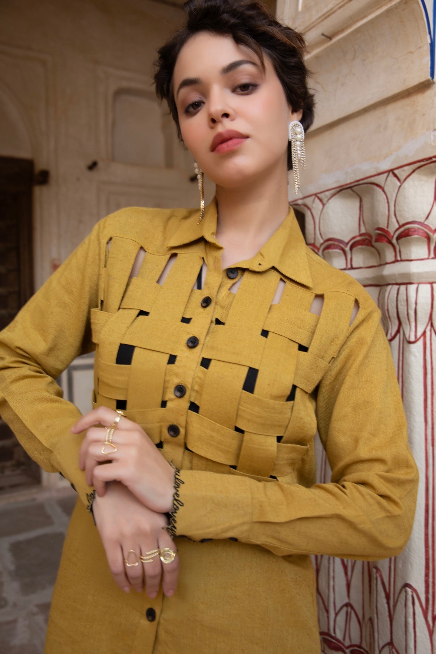 The Honeycomb Grid Shirt is a striking blend of structure and bold design, crafted in a rich mustard hue that exudes warmth and elegance. The standout feature is its intricate woven panel on the front, creating a geometric grid-like pattern that adds texture and depth to the shirt. The interwoven strips reveal subtle glimpses of skin or an inner layer, adding a contemporary edge to the traditional button-down silhouette.