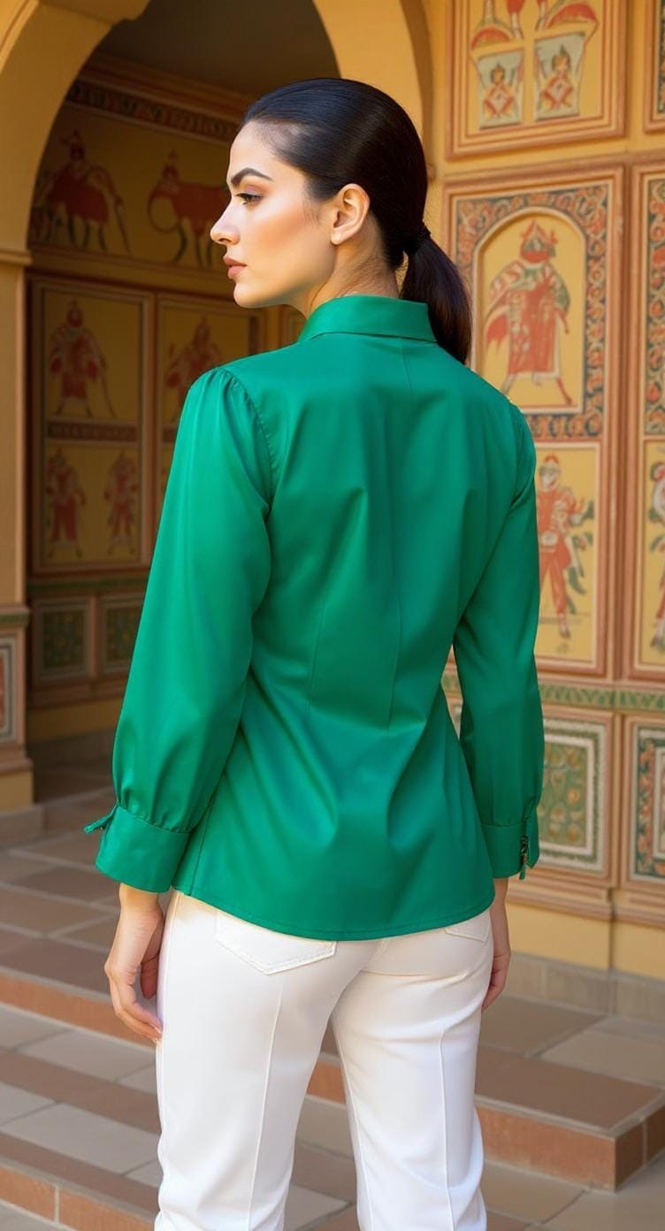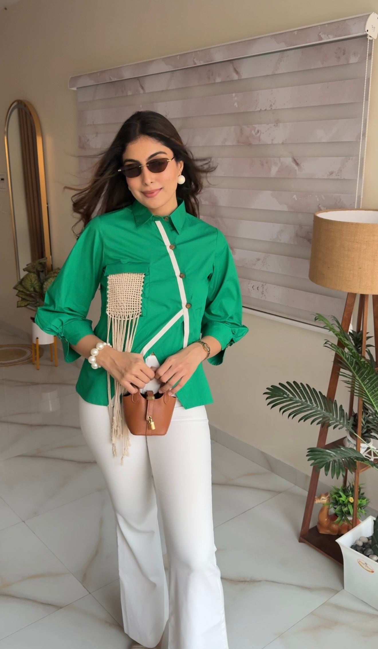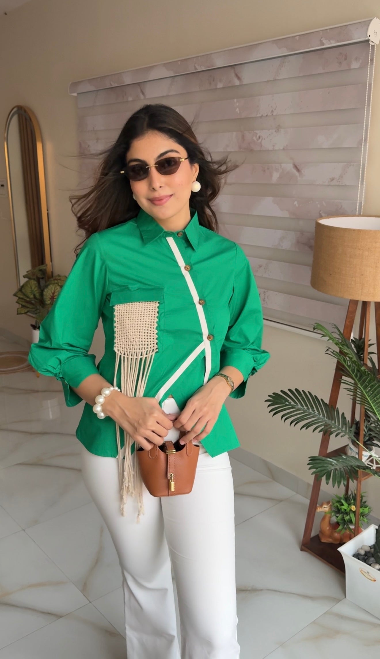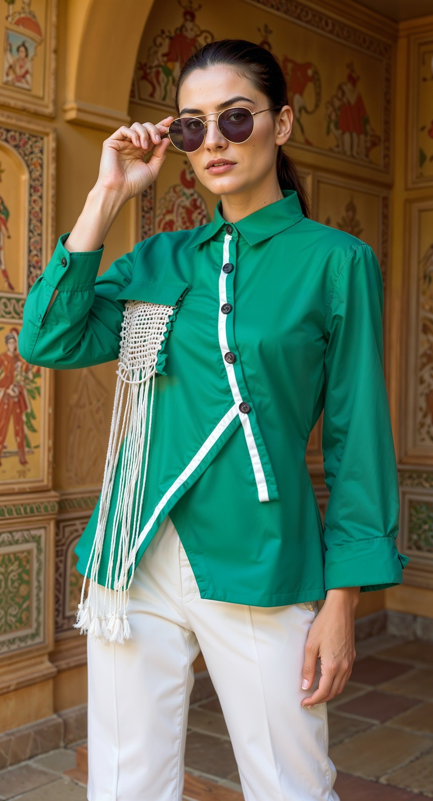 A modern twist on everyday dressing, this emerald green shirt is crafted in 100% cotton poplin and elevated with an asymmetrical placket and handcrafted macramé pocket detail. A structured silhouette meets soft boho flair, making it a versatile standout for day-to-evening looks.