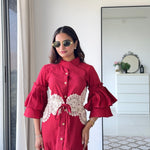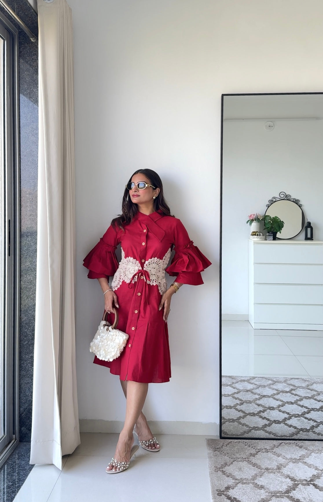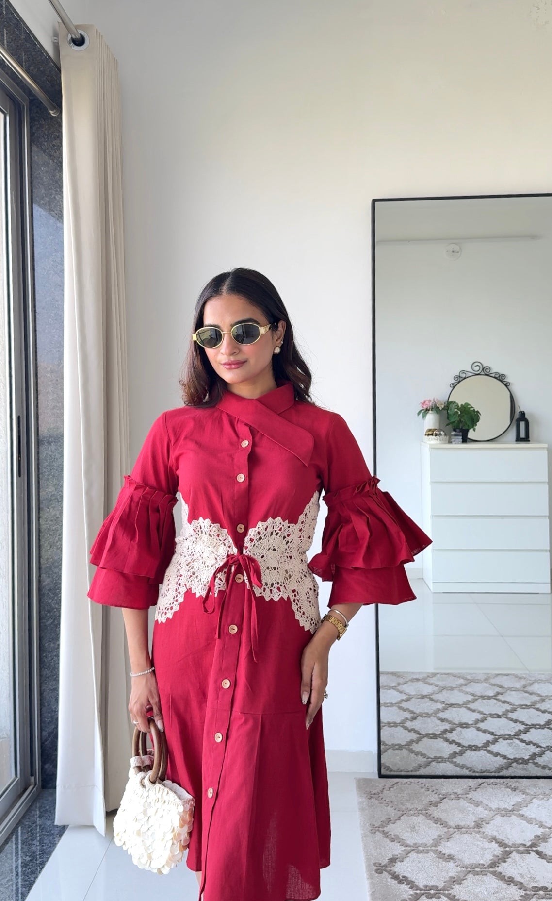 A statement shirt dress in a rich ruby hue, blending structure with feminine details. Designed with ruffled sleeves and a handcrafted crochet belt that accentuates the waist — this piece brings comfort and elegance together for any occasion.
