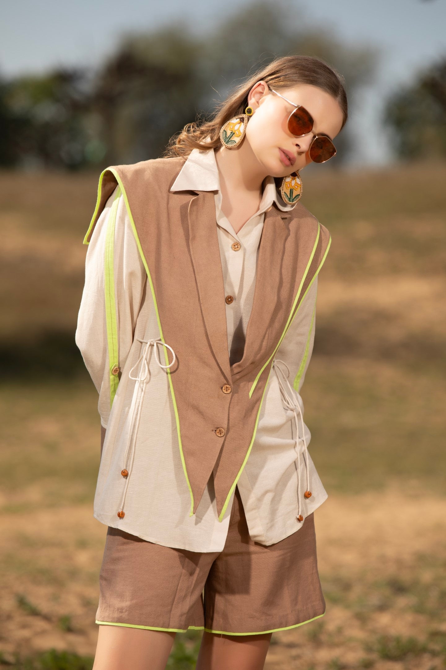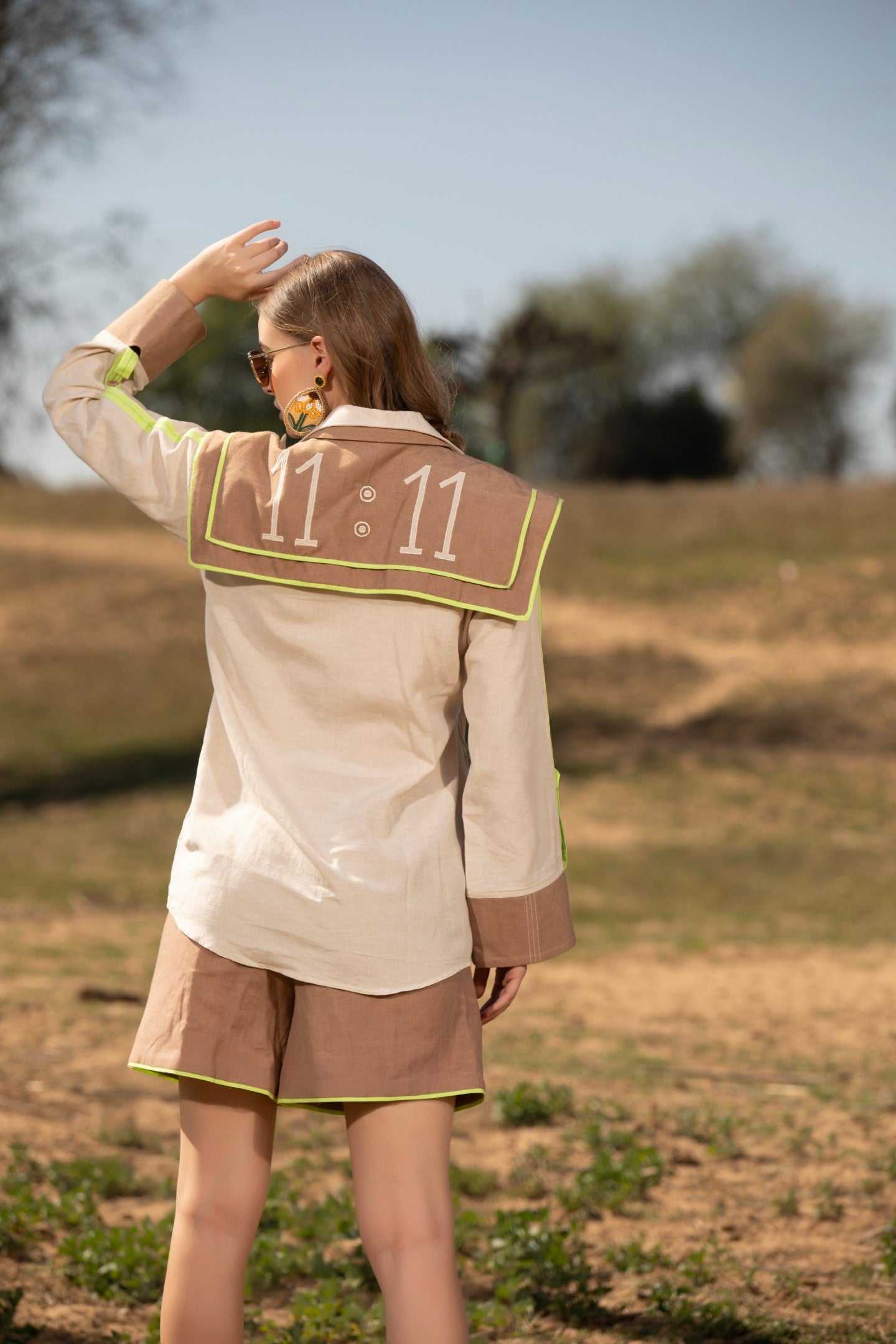The Aura:11 Shirt combines timeless elegance with a modern twist. Crafted from soft cotton khadi fabric, this cream and brown cape shirt features striking neon detailing that adds a contemporary edge. The standout 11:11 numerical logo embroidery on the back symbolizes alignment and manifestation, giving the piece a unique, spiritual touch. Perfectly blending tradition with innovation, this shirt is a statement of style, designed for those who seek both comfort and sophistication.