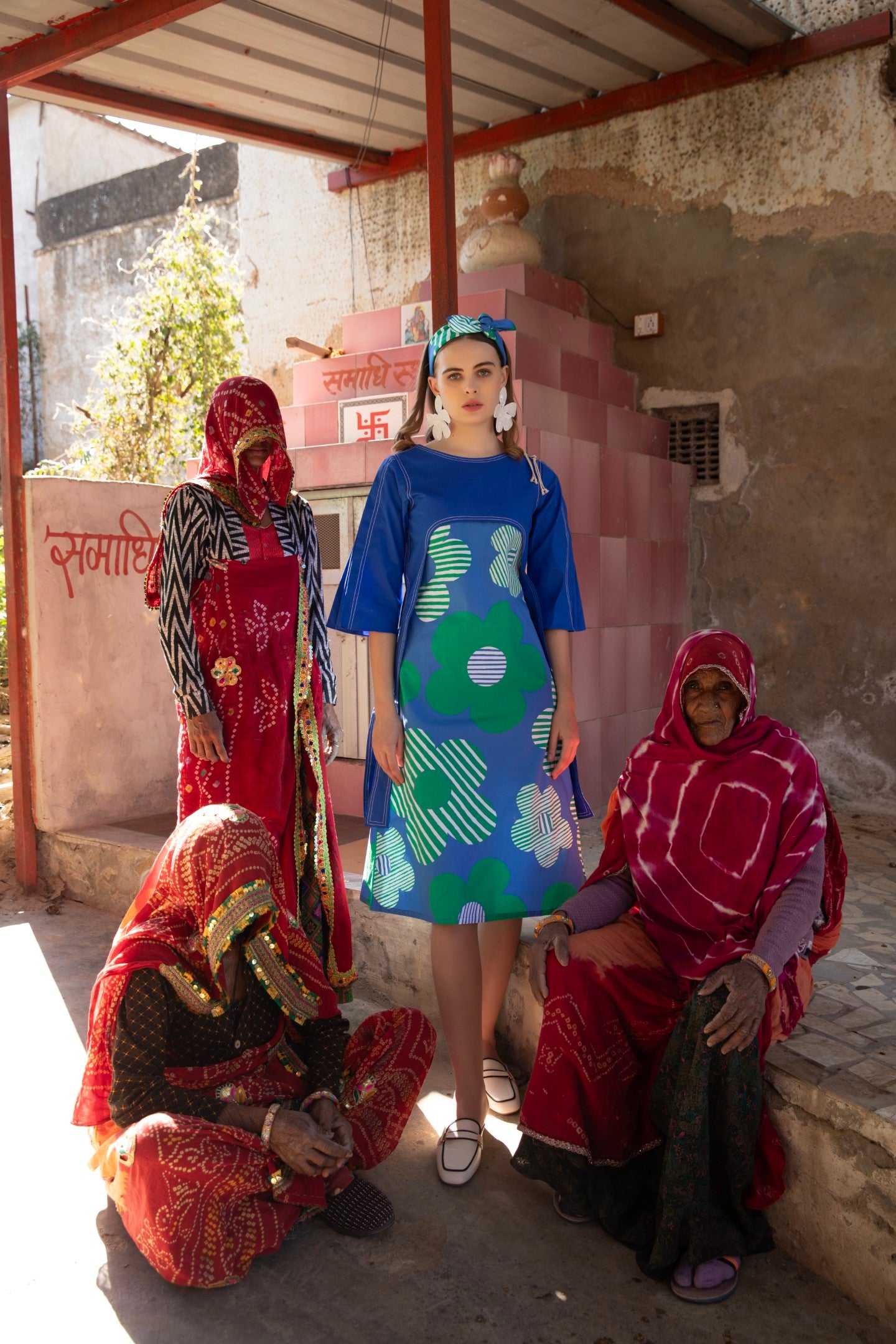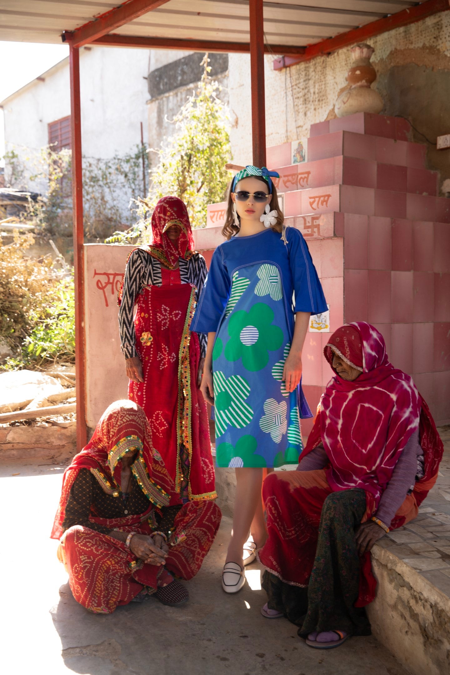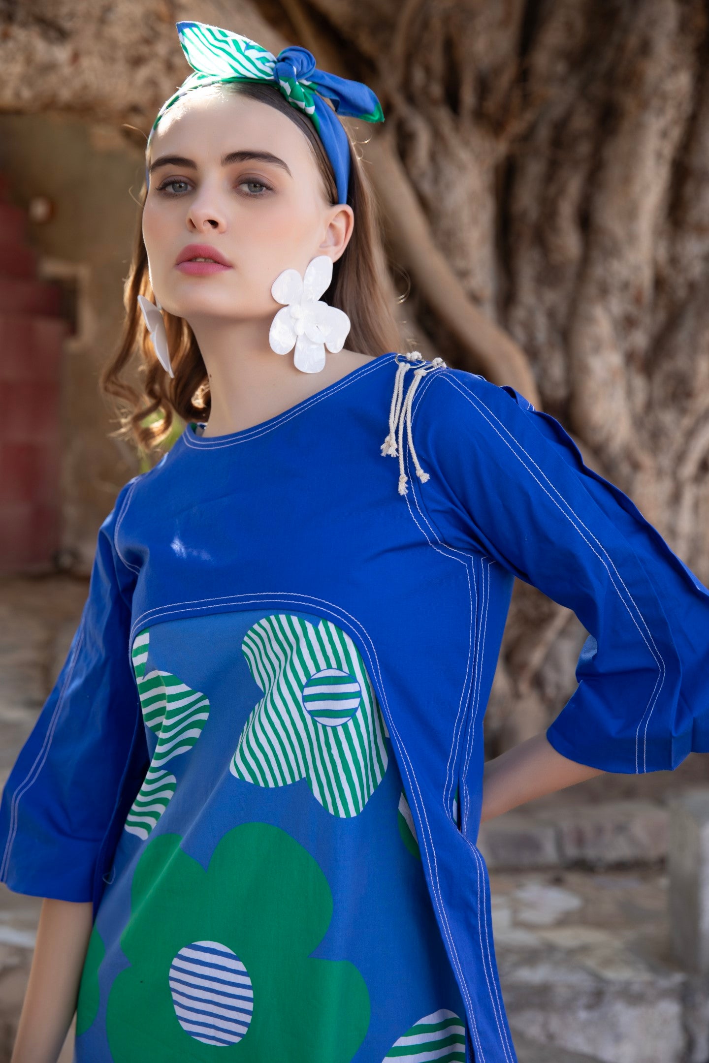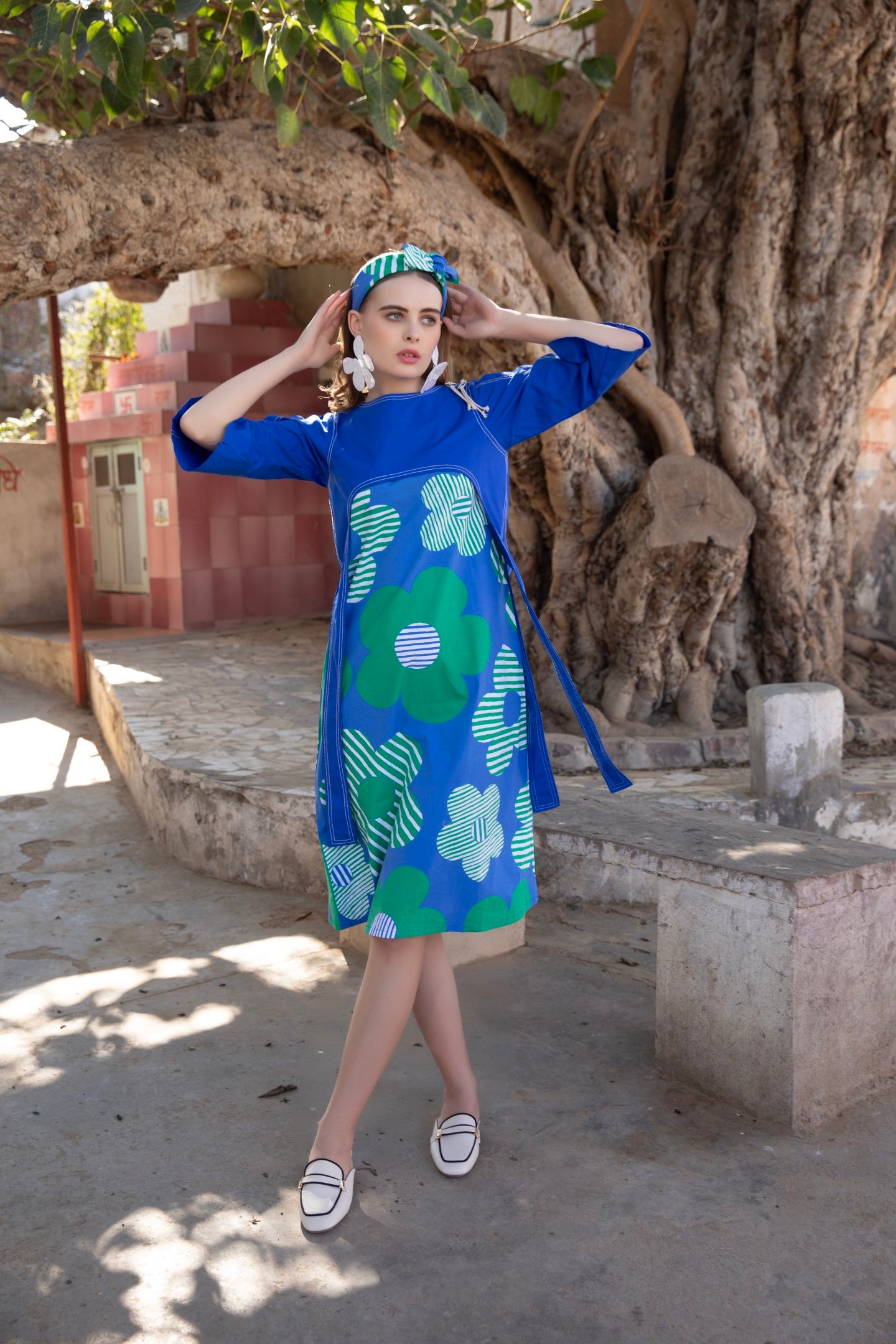 The Evelyn Petal Cape Dress is a vibrant celebration of color and style, featuring a striking blue background adorned with bold green floral prints and playful white stripes. Designed with three-quarter sleeves and a relaxed fit, this dress offers both elegance and comfort, making it perfect for any occasion. The unique combination of floral elements and contemporary patterns creates a visually stunning look that is both chic and fun. With its modern silhouette and lightweight fabric, the Evelyn Petal Cape Dress effortlessly transitions from casual outings to delightful evening events, ensuring you make a memorable impression wherever you go.
